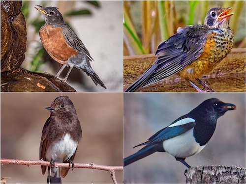 Breast: American Robin (top-left) Adolescent American Robin (top-right) Black Phoebe (bottom-left) Black-Billed Magpie (bottom-right)
