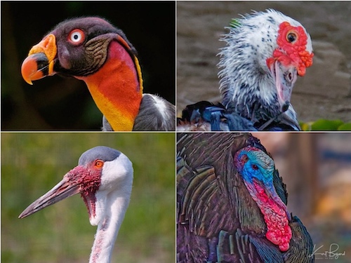 Caruncle: King Vulture (top-left) Muscovy Duck (top-right) Wattled Crane (bottom-left) Male Gould’s Wild Turkey (bottom-right)