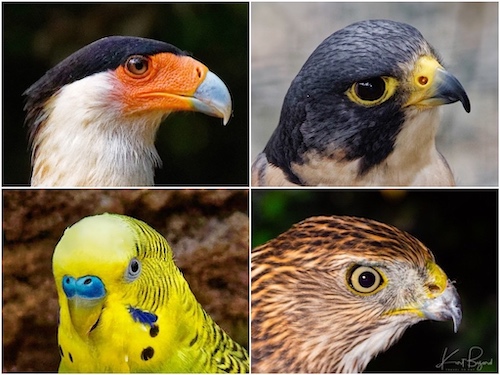 Cere: Crested Caracara (top-left) Peregrine Falcon (top-right) Budgerigar (bottom-left) Cooper’s Hawk (bottom-right)