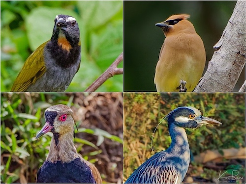 Chin: Buff-Throated Saltator (top-left) Cedar Waxwing (top-right) Southern Lapwing (bottom-left) Yellow-Crowned Night Heron (bottom-right)