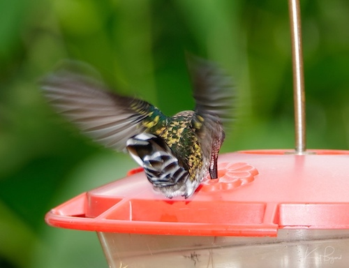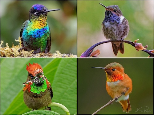Gorget: Male Fiery-Throated Hummingbird (top-left) Male Volcano Hummingbird (top-right) Male Tufted Coquette (bottom-left) Male Allen’s Hummingbird (bottom-right)