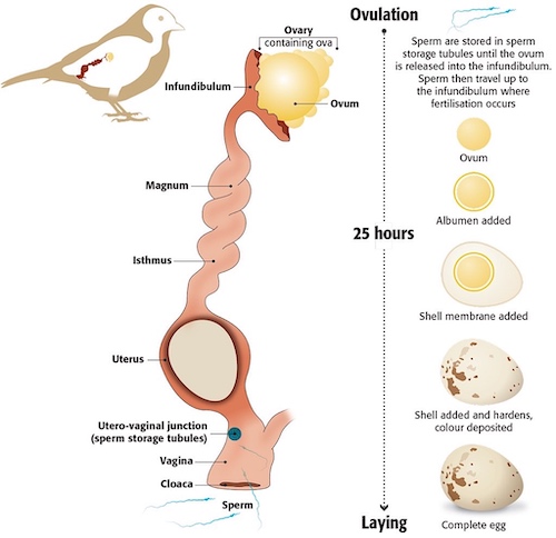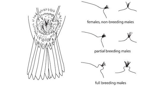 The cloaca is the single posterior opening for a bird’s digestive, urinary, and reproductive tracts and is used to expel feces and lay eggs. The cloaca is found on the rear of the body under the base of the tail, covered by feathers on the extreme lower abdomen. Those feathers surrounding the cloaca are called the crissum or undertail coverts. The cloaca and the area of the body where it is located, as well as the physical slit opening itself, is also frequently called the vent. During mating, the male perches on top of the female, who moves her tail feathers to the side to expose her cloaca. Arching back, the male rubs his cloaca against hers. During the breeding season, the cloacal area swells and the tissues protrude slightly outside the body to make breeding easier. Male birds show more swelling, and bird banders will gently blow on a bird’s vent to expose the cloaca and examine its size to determine a bird’s gender.