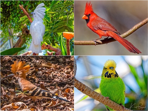 Crest: White Cockatoo (top-left) Male Northern Cardinal (top-right) Madagascan Hoopoe (bottom-left) English Budgie (bottom-right)