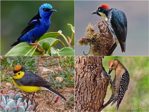Blue Crown of Red-Legged Honeycreeper (top-left) Red Crown of Acorn Woodpecker (top-right) Orange Crown of Collared Whitestart (bottom-left) Red Crown of Gila Woodpecker (bottom-right)