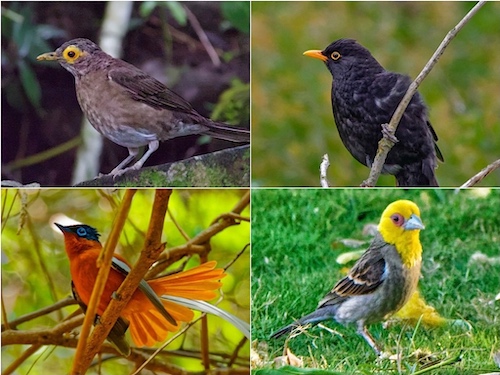 Eye Ring: Spectacled Thrush (top-left) Eurasian Blackbird (top-right) Malagasy Paradise Flycatcher (bottom-left) Sakalava Weaver (bottom-right)