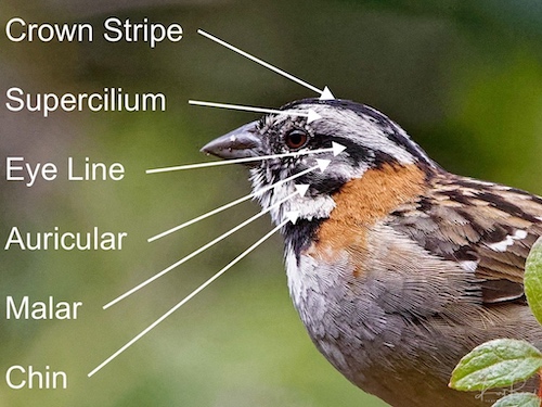 Sparrows and finches have many facial lines and it seems natural to compare these lines to corresponding features on the human face. These same lines can be found on many birds of all sizes but they seem to be especially common in smaller birds. If there is only one crown stripe is called just that, the crown stripe. If it is flanked by two additional stripes these are called the lateral crown stripes. The line above the eye is called the supercilium or eyebrow of course. While line directly below the eye is called the malar or mustache line, which often extends downward and back like a true mustache. The auricular (ear) and chin will be discussed in more detail below. Keep in mind that these lines can be both dark and light while retaining their assigned name.