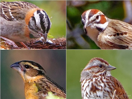 Facial Markings: Rufous Collared Sparrow (top-left) Lark Sparrow (top-right) Female Black Headed Grosbeak (bottom-left) Song Sparrow (bottom-right)