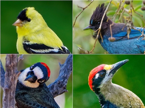 Forehead: American Goldfinch (top-left) Steller’s Jay (top-right) Female Acorn Woodpecker (bottom-left) Male Black-Cheeked Woodpecker (bottom-right)