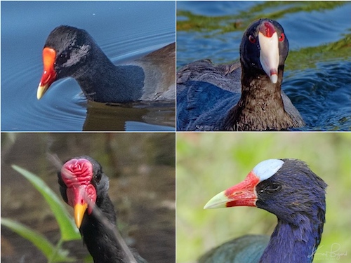Frontal Shield: Common Gallinule (top-left) American Coot (top-right) Wattled Jacana (bottom-left) Purple Gallinule (bottom-right)