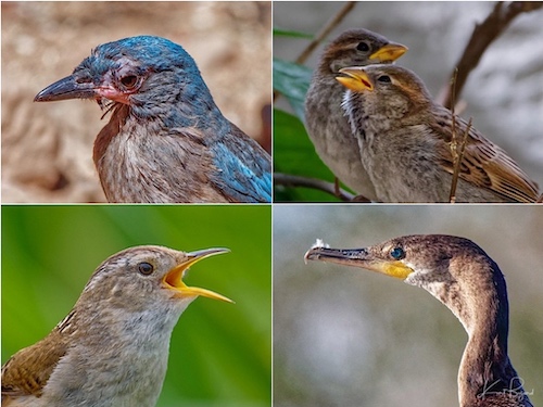 Gape: Mexican Jay (top-left) House Sparrows (top-right) Marsh Wren (bottom-left) Neotropic Cormorant (bottom-right)