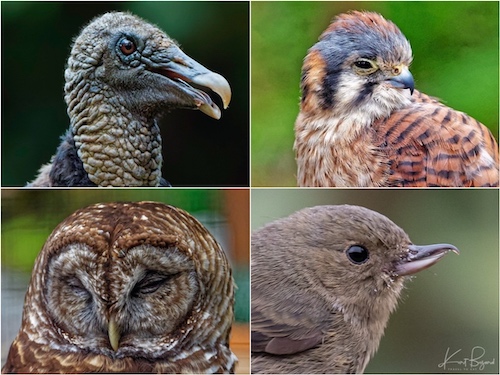 Hooked Bill: Black Vulture (top-left) American Kestrel (top-right) Barred Owl (bottom-left) Female Slaty Flowerpiercer (bottom-right)
