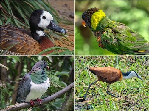 Nape: White Faced Whistling Duck (top-left) Marigold Lorikeet (top-right) Kererū (bottom-left) African Jacana (bottom-right)