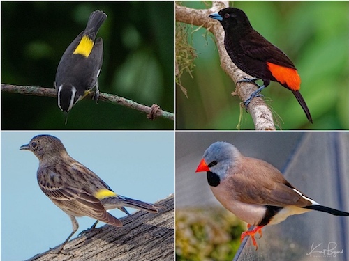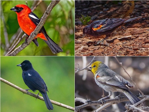Wing Spots: Male White-Winged Tanager (top-left) Male Red-winged Blackbird (top-right) Male White-Lined Tanager (bottom-left) Verdin (bottom-right)