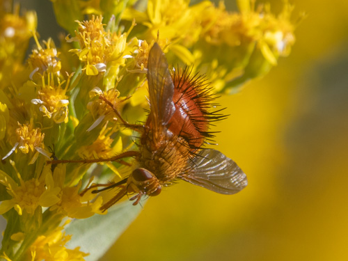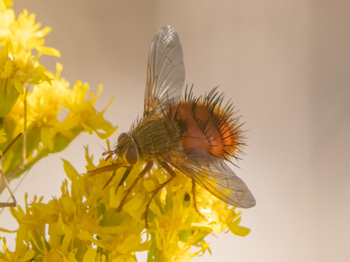 It is a large, hairy fly with a distinctly orange abdomen and prominent, heavy black setae (bristles). It also has greatly elongated palpi that stick straight forward from under its head.