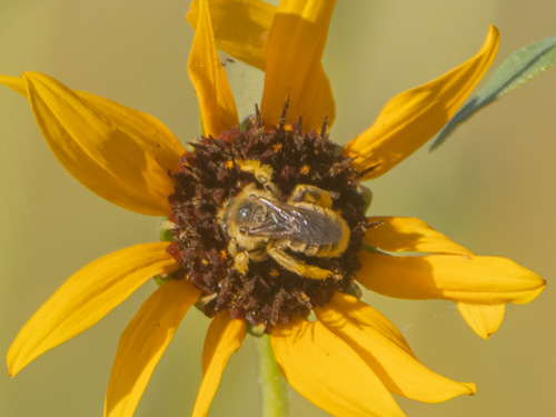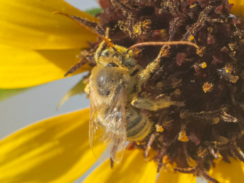 Diadasia enavata, also known as the sunflower chimney bee, is a species of bee found in North and Central America that specializes in pollinating plants of the Asteraceae family, particularly sunflowers. This shaggy, golden-haired bee is a key pollinator for species like Coreopsis tinctoria, the Ash Meadows Gumplant (Grindelia fraxino-pratensis) and is associated with sunflower patches.