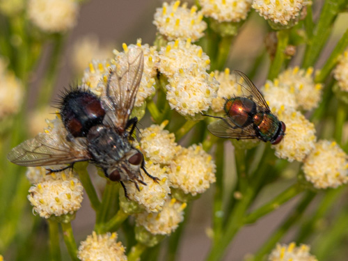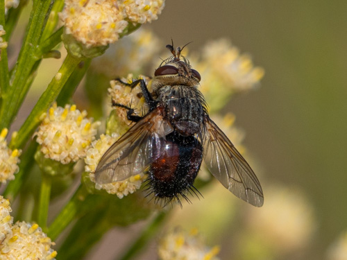 It is known for its larvae developing inside caterpillars and beetle larvae, making it a natural pest controller. These flies are also important pollinators, feeding on nectar from flowers like Rudbeckia laciniata. They have a hairy, spiky appearance, and can be red, black, brown, or orange, often with a pale green face.