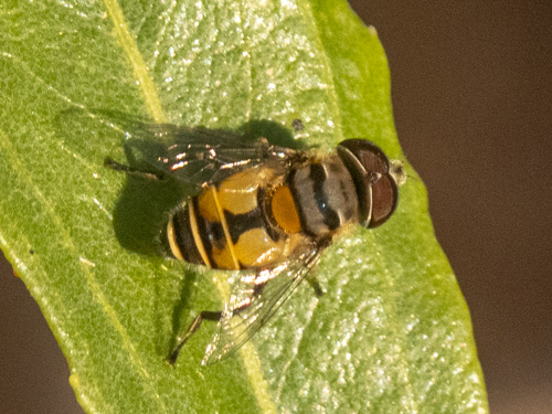 In a Single-banded Plushback (Palpada alhambra), the dorsal and ventral bands are typically aligned or offset by a small amount. In a Double-banded Plushback (Palpada agrorum), the dorsal and ventral bands are offset significantly, appearing to alternate or be positioned opposite each other. When viewing this fly from the top or bottom, it is almost exactly the same as the Double-banded Plushback. The other major factor in the identification of this particular hoverfly, is the distribution. The Double-banded Plushback is found over both north and South America, and very common in the eastern United States. The Single-banded Plushback is found in California, Nevada, and Arizona. This species is characterized by its orange-yellow body with narrow, dark bands on the abdomen and three encircling yellow bands. The thorax is covered with a black metallic shield on the upper side with white to gray hair, and the rest is covered with orange-yellow hair.