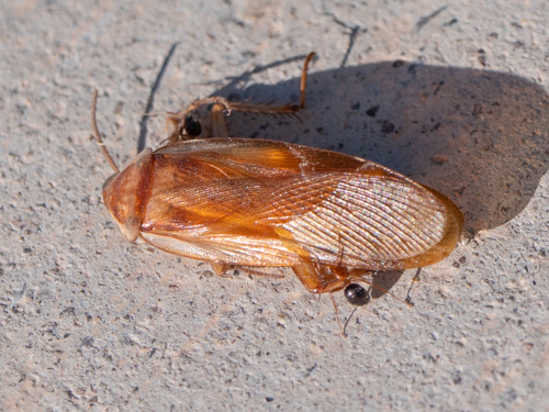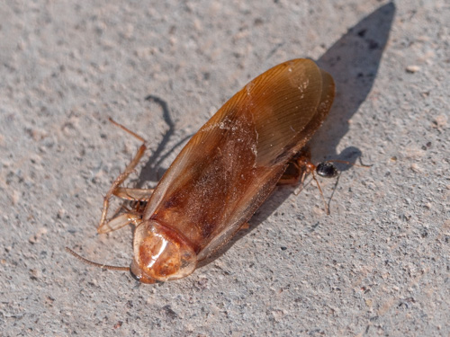 Adult males are a brownish orange or red, are slender, and have long, yellowish wings which allow it to attract females and to glide. Adult females are dark brown to black, with cream-colored markings on the shield and a cream-colored stripe edging its wings; they are broader than males, and have short vestigial wings. Nymphs are brown in front, black on the rear, and are wingless.
