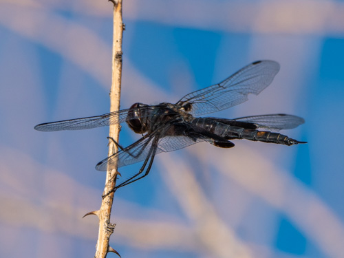 The black saddlebags is a dragonfly with memorable markings. Two dark blotches on each hindwing, positioned close to the body, look like saddlebags. This skimmer species typically stays in flight and rarely perches for long.It is a relatively large dragonfly at about 5 centimetres (2 in) in length. The body is thin and black, and the female may have lighter spotting or mottling dorsally. The head is much wider than the rest of the body and is dark brown in color.