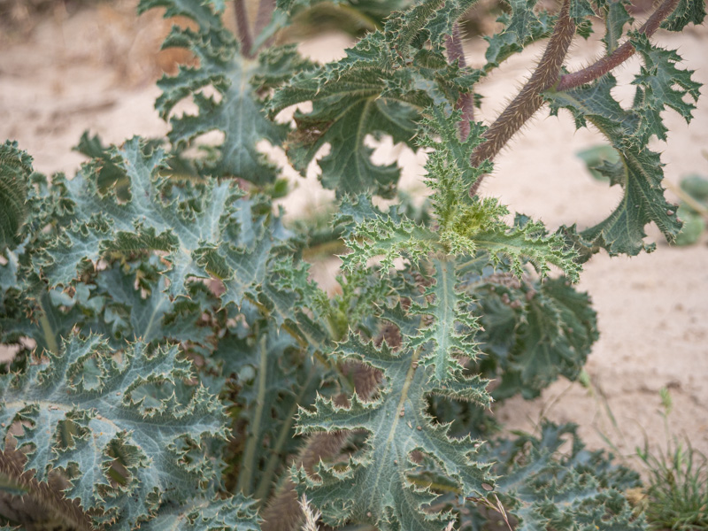 This poppy bears its flowers on erect, spiny stems which can exceed a meter in height. The sap is yellow. The blue-green or mint-green, lobed leaves are also very prickly. The white poppy blooms usually have six crinkly petals, each up to 4 centimeters long, and three sepals. The center of the flower is surrounded by a dense ring of up to 250 small yellow or orange stamens bearing the pollen. The flowers are often compared to sunny-side-up eggs, with the dark pistil in the center as a dot of pepper. The fruits are spiny white capsules 3 to 5 centimeters long, each containing many small seeds. The leaves and seeds contain alkaloids which are probably toxic. Chicalote is a common name for several species of prickly poppy, most notably Argemone platyceras and Argemone munita. Has the potential to be a very troublesome weed and exudes a sap which, if ingested, is poisonous to humans and range animals.