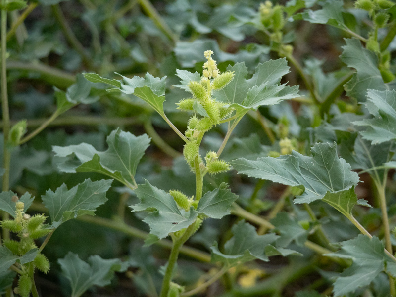 It is a weedy annual plant known for its prickly burs that can stick to clothing and fur. It has a stout, hairy stem, large, rough leaves, and is toxic to livestock, especially the seedlings. While some parts have been used in traditional medicine, the plant is poisonous and should not be consumed. The stems are round or slightly ribbed. They are often speckled with purple and have short white hairs scattered across the surface. The alternate leaves are up to 8 in long and 6 in across. They are cordate or ovate-cordate with bases that are well-rounded or indented and tips that are broad and blunt. Their margins are shallowly lobed or coarsely toothed, while the upper surface has a sandpapery texture. Because Common Cocklebur is monoecious, each raceme produces several male compound flowers along its upper half, while several female compound flowers occur in the lower half. The male compound flowers are about ΒΌ inch across, consisting of numerous staminate florets that have stamens with prominent white anthers. The female compound flowers are initially green, but turn brown as they mature and are slow to detach from the racemes. Each female flower within the bur-like bract produces a single oblong seed that more or less tapers to a point at each end. The seeds are often covered with dark membranes. The edges of Lake Mead are covered with this cocklebur.