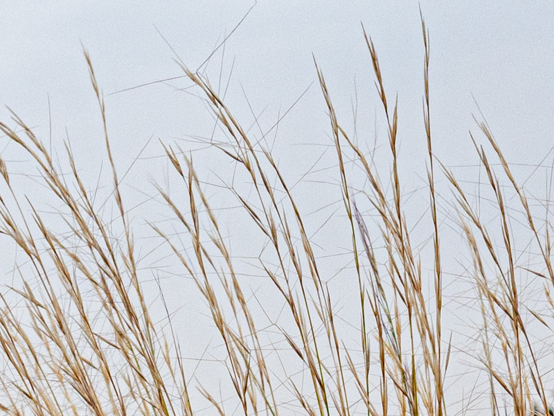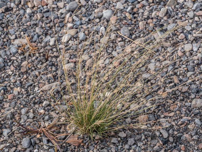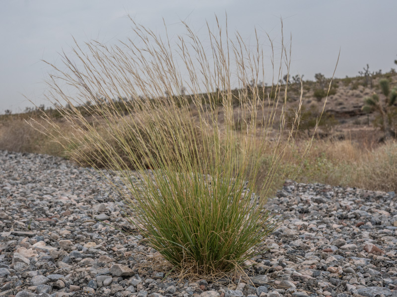 This is a perennial bunchgrass, growing erect to under a meter in height, and the flower glumes often assumes a light brown to reddish-purple color. There are several varieties with overlapping geographical ranges. This is not considered to be a good graze for livestock because the awns are sharp and the protein content of the grass is low. The leaves are narrow and roll inward. The florets and awns of the inflorescences spread outward, creating a brushy appearance. The florets turn purplish-red. The awns can tend to catch in the wool or irritate the skin, mouths, or nostrils of livestock.