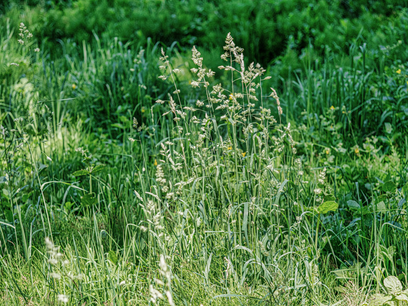 Orchard Grass is a cool-season perennial bunching grass that grows up to 6 feet high. It is a cespitose (clumping, mat-forming) grass native to Eurasia and Africa that is generally considered a weed. It can be found in meadows, pasture, roadsides, and rough grassland and has become invasive in some areas of eastern USA. Orchard grass forms a dense network of non-rhizomatous roots, making it useful for erosion control. It has been introduced throughout most of the cool-temperate regions of the world as a forage grass in pastures, and for hay and silage production. It is highly palatable to all classes of livestock, although it is considered a weed in turf grass. Cats are said to like to chew it, hence the common name Cat Grass. Each culm terminates in an inflorescence on a long naked stalk. The culms are light green, terete, and glabrous; later they become straw-colored (stramineous). The leaves of both fertile and infertile shoots have a similar appearance.