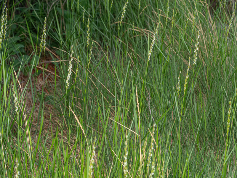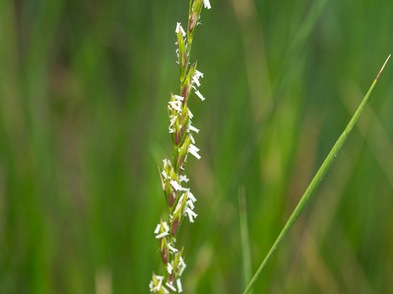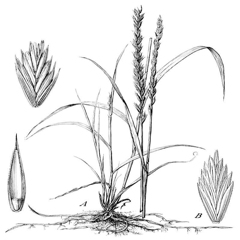 It is a widespread perennial grass with a strong, creeping root system that makes it a common weed in many parts of the world. It has flat, green leaves and produces long, thin flower spikes with tiny, golden spikelets. It has creeping rhizomes which enable it to grow rapidly across grassland. It has flat, hairy leaves with upright flower spikes. The stems ('culms') grow to 60 inches (40–150 cm) tall. The flower spike is slender and erect, resembling a small wheat head. Each spikelet has 3 to 8 florets, which can be awnless or have very short awns. It is a perennial grass that reproduces by both seeds and underground rhizomes.