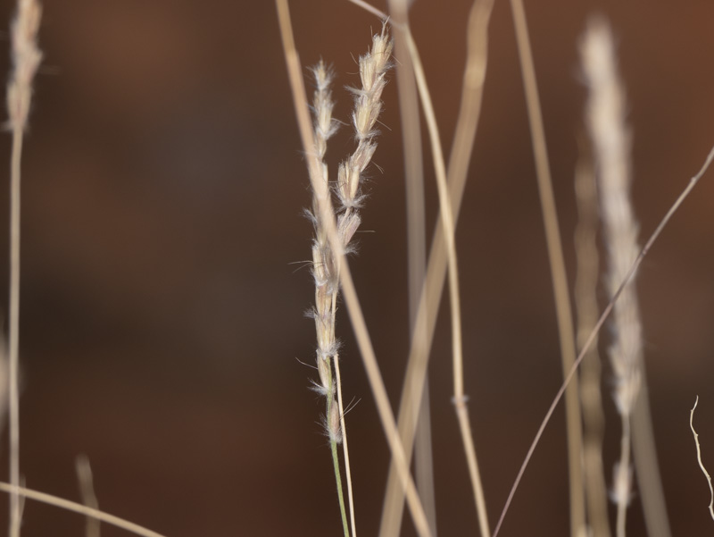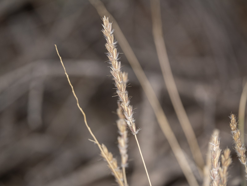 It is a long-lived, shrubby or bushy, clumping perennial grass producing coarse, erect stems reaching 1 m (3.3 ft) in maximum height. Big galleta is heavily grazed and is valuable as a fair to good forage crop for sheep and cattle. It spreads from hard, woody rhizomes to form grayish, hairy, open, erect hummocks and clumps. The clumps can live to more than 100 years old. Its primary means of reproduction is by rhizomes, possibly also by tillering. It has a bush-like appearance because it is highly branched at the base. Clumping results from spread by tillers or short rhizomes. Clumps of leaves are 3 to 4 ft (0.91 to 1.22 m) wide. Seeds fall when mature, but their stalks persist, sticking out from the clumps like zigzagging wires, by which the plant can be identified at a distance. Fuzzy to wooly stems are stiff, heavy, and coarse. The stems are unusual among grasses in that they are solid, even between the nodes, whereas most grasses have hollow stems. Stems have nodes that are lined with long, sometimes curly hairs. Leaf blades are coarse and firm, fairly wide, and almost straight, from grayish to blue-green, sometimes with light wooly fuzz, and have curly hairs and edges that are rolled upward.