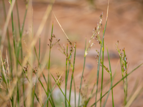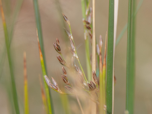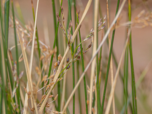 A flowering stem has no leaves to speak of, just one or more bladeless sheaths at the base. Sheaths are reddish at the base and green to brown above. Stems are dark green, round in cross-section, smooth, erect, unbranched, and create colonies from long rhizomes. Flowers are single, not in heads of 2 or more, on stalks of varying lengths, with 6 tepals (petals and similar sepals) in 2 layers, 3.5 to 5.5 mm long. In North America, experts generally recognize three main forms of Baltic rush which differ in flower proportions and in the leafiness of the stems. Besides differing in floral features, rushes also can be distinguished from grasses and sedges by their solid, round stems. By comparison, sedges have 3-sided stems, and grasses have hollow, round stems. The rhyme “sedges have edges, rushes are round, and grasses are hollow right up from the ground” has helped countless plant taxonomy students remember these differences at exam time.