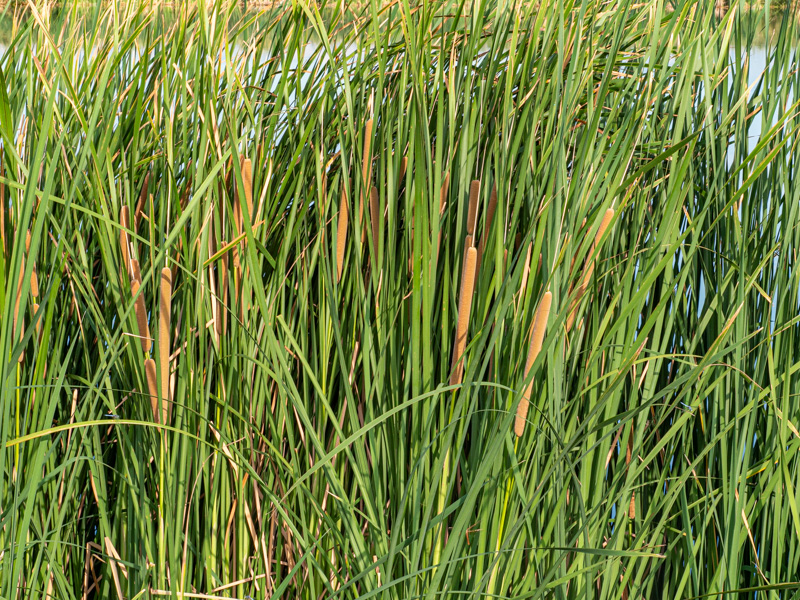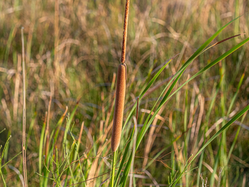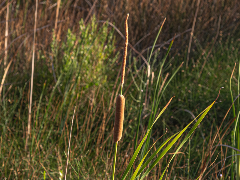 Tall, erect plant with long, flat, green leaves and a cylindrical flower spike at the top. The spike is divided into a top section of male flowers and a bottom section of female flowers