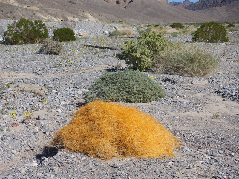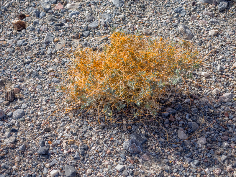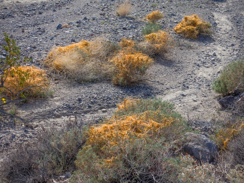 It is a parasitic, leafless vine native to western North America that grows in saline habitats like salt marshes and vernal pools. It wraps its orange or yellowish stems around host plants, using specialized structures called haustoria to steal nutrients and water. The leaves are rudimentary and scale-like, virtually non-existent, as the plant has lost all ability to do photosynthesis due to no green leaves and no green stems. Salt Marsh Dodder flowers are white glandular corollas. Each flower is bell-shaped with five pointed triangular lobes, after pollination by many kinds of native bees and native butterflies, develop fruits that sweet and edible to small native mammals and native birds, including the Belding's Savannah Sparrow.