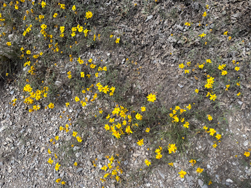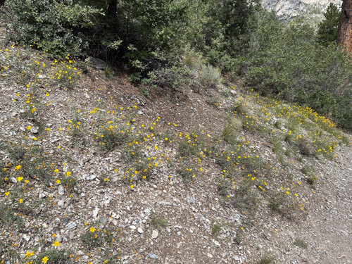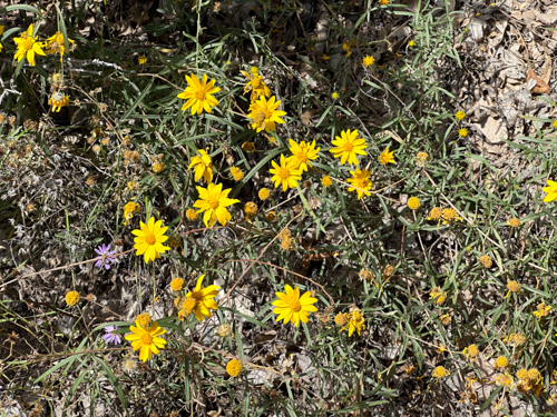 Nevada Goldeneye (Heliomeris multiflora var. nevadensis) is a variety of the more widespread Showy Goldeneye (Heliomeris multiflora). The main differences are the thinner leaves and more straggly appearance. It has green linear leaves that are narrow and pointed, typically covered in stiff, short hairs. The stems are slender, wiry, and often bushy, growing to be between 8 and 48 inches tall. Both the ray flowers and disk flowers are yellow forming heads 1 to 1.5 inches broad.