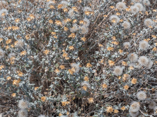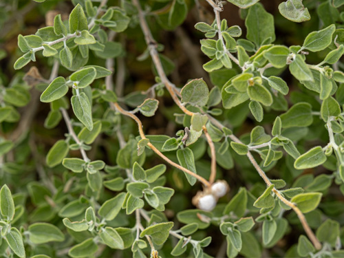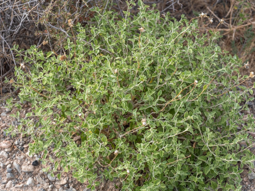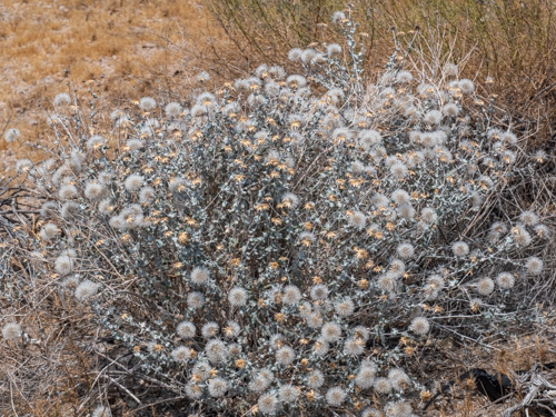 Brickellia incana is a shrub growing in a spherical clump on the sandy desert floor, 40 centimeters to 1 meter tall. The leaves are gray-green to white with a thin coat of woolly fibers, oval in shape and up to 3 centimeters long. The inflorescences hold solitary flower heads, each about 2.4 centimeters long and lined with woolly gray-green to grayish purple phyllaries. Each flower head holds an array of about 60 red, yellowish, or grayish disc florets. The fruit is a hairy spherical achene about a centimeter long with a pappus of bristles