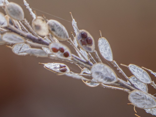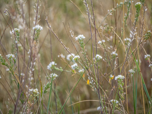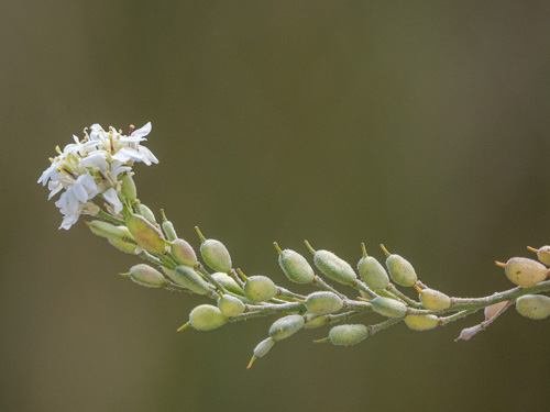 It is hairy, with flattened star-shaped and simple hairs. It produces one or more upright stems usually 30 to 80 centimeters tall, sometimes exceeding one meter. The basal leaves are up to 8 to 10 centimeters long. The leaves are hairy and grayish. The inflorescence is a dense raceme of flowers. The four white petals are roughly half a centimeter long and are tipped with two lobes. The fruit is a hairy silicle up to a centimeter long. Hoary alyssum is toxic to horses when they eat the fresh plant in a pasture or the dried plant in hay.