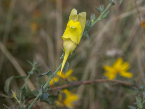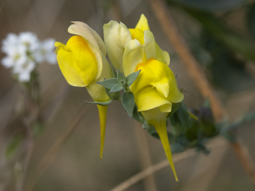 Leaves are broad and heart-shaped and are arranged in an alternating pattern. The leaves are attached to the stem ascending outward and are smooth, waxy and glabrous. In addition, they do not have petioles. Linaria dalmatica typically grows in a mass of stems, three or four feet tall. Flowers are numerous along stout vertical stems above thick, clasping, ovate leaves. The raceme of flowers are bilaterally symmetrical and have spurs pointing downwards.