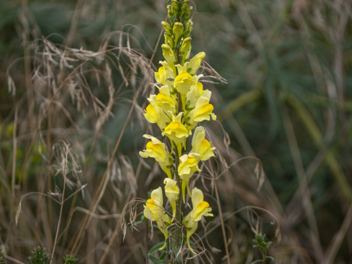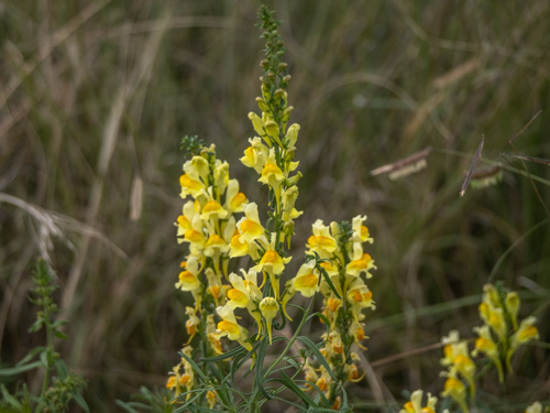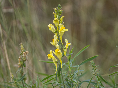 It is a perennial plant with short spreading roots, erect to decumbent stems with fine, threadlike, glaucous blue-green leaves. The flowers are similar to those of the snapdragon, pale yellow except for the lower tip which is orange, borne in dense terminal racemes from mid summer to mid autumn. The flowers are mostly visited by bumblebees since they are strong enough to open the flower's lip to access the nectar.Yellow toadflax is an escaped ornamental brought to this country in the mid-1800’s. It was used as a yellow dye for centuries in Germany, so immigrants, especially the Mennonites, cultivated it for use in dyeing. Yellow toadflax, which is adapted to moister soils, is more common throughout eastern North America while Dalmatian toadflax is more common in the western United States, although both can be found throughout the continent. The easiest way to distinguish between yellow and Dalmation toadflax is by the leaves. The lance-shaped, gray-green, 2” long leaves of yellow toadflax are stalkless and pointed at both ends. Dalmatian toadflax has clasping, heart-shaped or egg-shaped leaves.